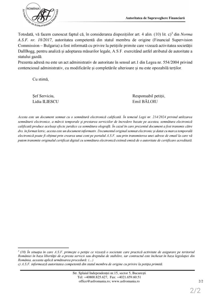 În răspunsul oficial transmis unui petent, ASF arată că DallBogg este o societate din Bulgaria, activă în România în regim Freedom of Services, și că autoritatea din statul de origine, Financial Supervision Commission, este autoritatea principală de supraveghere.