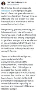 „Nu, acestea sunt minciuni și propagandă promovate de bunăvoie, în numele instigatorilor care vor să submineze eforturile neobosite ale președintelui de a pune capăt acestui război sângeros. Asta este ceea ce NATO și UE doresc cu adevărat: să atragă armata Statelor Unite direct într-un război cu Rusia”, a transmis Tulsi Gabbard.